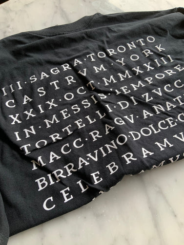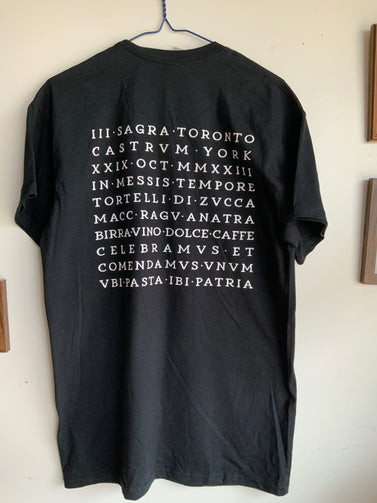 An ancient latin inscription to commemorate the 3rd Sagra do Toronto. Warning: Be prapared for many annoying questions like ‘what is that shirt? What does it say? ‘ . Our recommendation ? Come up with a ridiculous explanation everytime.
